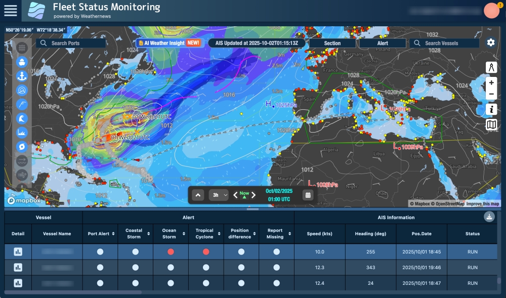 AI Weather Insight uses AI to automatically generate weather and marine insights in text and table formats for oceans throughout the world up to five days in advance, allowing SeaNavigator users to obtain the latest summaries that account for such factors as the probability of a tropical cyclone, at any time. The service also uses AI to automatically analyze the duration of impact and risk of encounter regarding inclement weather based on the latest vessel position and route data, allowing users to instantly identify vessels affected by inclement weather.